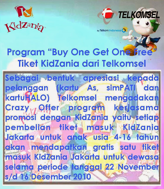 Sebagai bentuk apresiasi kepada para pelanggan (kartu As, simPATI dan kartuHALO) Telkomsel mengadakan Crazy Offer program kerjasama promosi dengan KidZania yaitu setiap pembelian tiket masuk KidZania Jakarta untuk anak usia 4-16 tahun akan mendapatkan gratis satu tiket masuk KidZania Jakarta untuk dewasa selama periode tanggal 22 November s/d 16 Desember 2010.