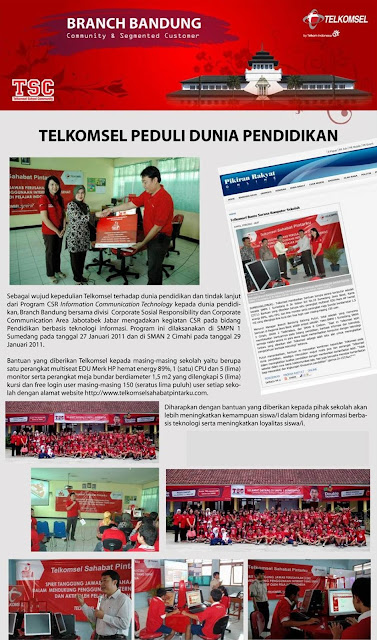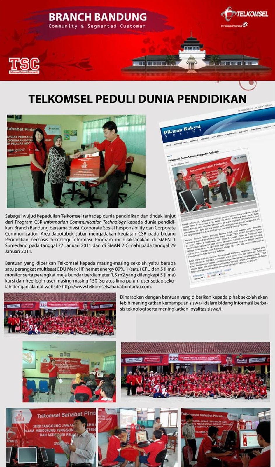 Hari ini Telkomsel memberikan bantuan berupa sarana komputer sekolah kepada SMPN 1 Sumedang di Jalan Kebon Kol No.18 Sumedang Jawa Barat. Bantuan ini merupakan wujud kepedulian Telkomsel terhadap dunia pendidikan dan merupakan bagian dari program Corporate Social Responsibility Telkomsel pada bidang Pendidikan berbasis teknologi informasi.