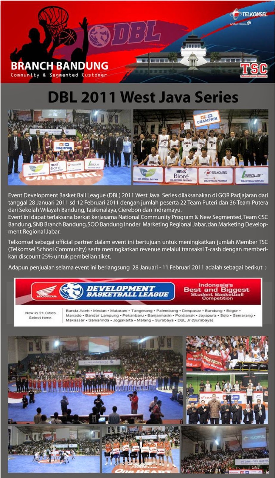 Telkomsel sebagai official partner di Development BasketBall League (DBL) yang akan berlangsung selama bulan Januari sampai dengan Oktober 2011.