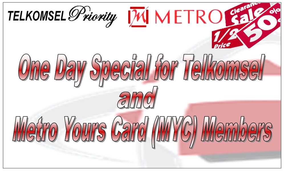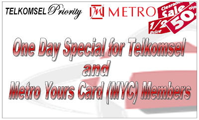 Telkomsel bekerjasama dengan METRO Department Store menghadirkan promo istimewa “One Day Special for Telkomsel and Metro Yours Card (MYC) Members”, berupa diskon besar besaran hingga 50%, plus tambahan 10% potongan harga. Promo ini hanya berlaku selama satu hari yaitu di tanggal 29 Juni 2011 di seluruh METRO Dept Store yang ada di Jakarta, Bandung, dan Makassar.