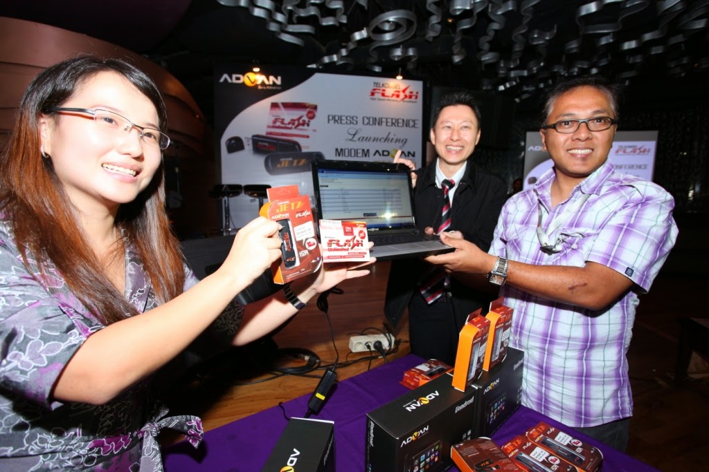 (kanan-kiri) Manager Broadband Bundling Management Telkomsel Iwan Darmawan, Head of Channel Distribution Advan Chandra Tansri, dan Brand Manager Advan Ellen Gunawan mendemokan kecepatan akses internet TELKOMSELFlash menggunakan modem AdvanJetz di Jakarta (14/6). Telkomsel berkolaborasi dengan Advan menyediakan paket modem Advan seri DT8 yang memberikan unlimited akses internet TELKOMSELFlash secara gratis selama 3 bulan, hanya dengan harga Rp 369.000.